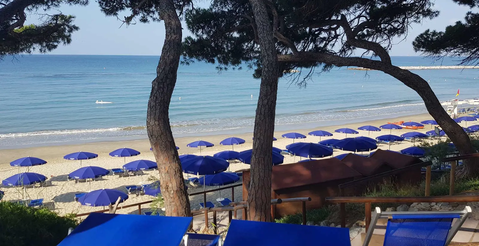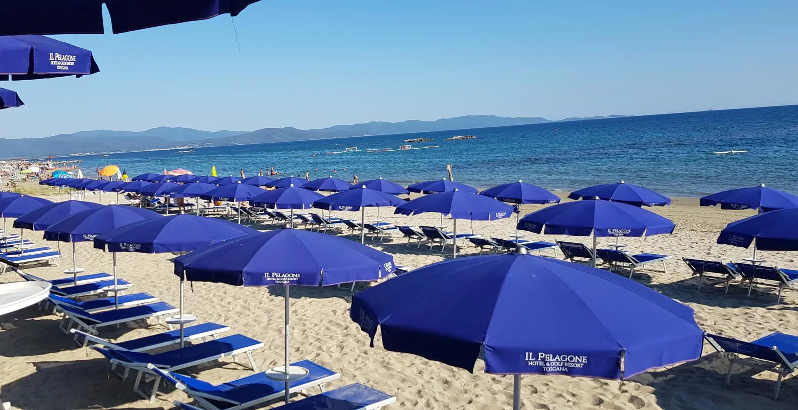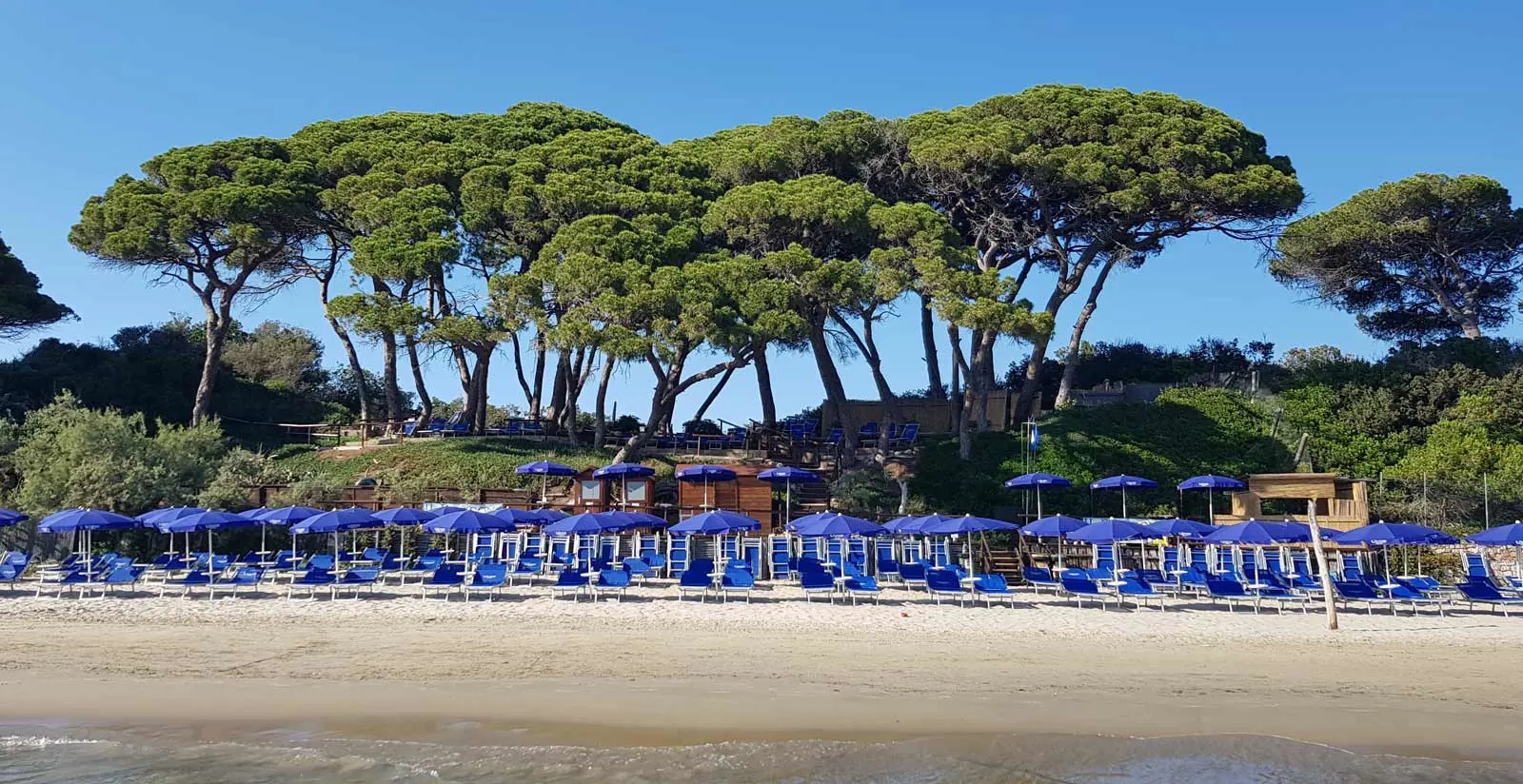 Nur 18 km vom Pelagone entfernt befindet sich ein exklusiver Privatstrand mit Liegestühlen und Sonnenschirmen. Die Pinienwälder reichen fast bis zur Küste und erzeugen kühle Schatten. Der gepflegte Sandstrand mit flach abfallendem Ufer ist sehr gut für Kinder geeignet und ein wunderbarer Ort zum Entspannen für die ganze Familie.