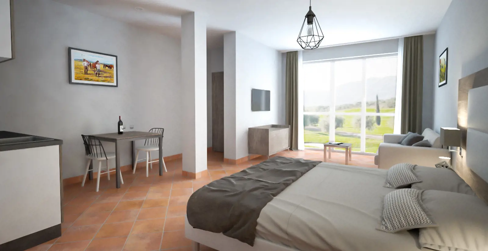 Apartment recently refurbished in typical Tuscany style, where a guest or a couple can relax in a warm ambience. A private space of 35 or 38 m², enriched by a double bed, sofa, bathroom with shower and bidet, terrace (ground floor) or balcony (at the first floor), air conditioning, small fridge, phone, satellite channels, flat screen TV, heating, hairdryer.